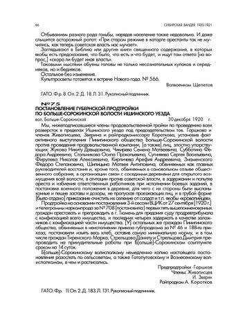 Постановление губернской продтройки по Больше-Сорокинской волости Ишимского уезда. вол. Больше-Сорокинская. 30 декабря 1920 г. // ГАТО. Фр. 11. Оп. 2. Д. 183. Л. 131. Рукописный подлинник.