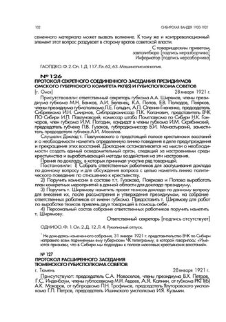 Протокол секретного соединенного заседания президиумов Омского губернского комитета РКП(б) и губисполкома советов. [г. Омск]. 28 января 1921 г.