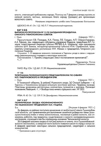 Телеграмма полномочного представителя ВЧК по Сибири И.П. Павлуновского в президиум ВЧК. г. Омск. 6 февраля 1921 г. // РГВА. Ф. 42. Оп. 1. Д. 1259. Л. 36. Дешифровка. Машинописная копия.