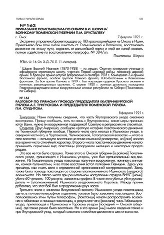 Приказание помглавкома по Сибири В.И. Шорина военкому Тюменской губернии П.М. Хрусталеву. г. Омск. 7 февраля 1921 г. // РГВА. Ф. 16. Оп. 3. Д. 75. Л. 11. Автограф.