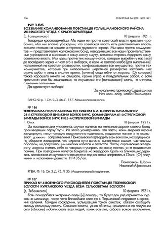 Телеграмма помглавкома по Сибири В.И. Шорина начальнику 21-й стрелковой дивизии войск ВНУС, командирам 61-й стрелковой бригады войск ВНУС и 85-й стрелковой бригады. г. Омск. 10 февраля 1921 г. // РГВА. Ф. 16. Оп. 3. Д. 75. Л. 35. Машинописный подлинник.