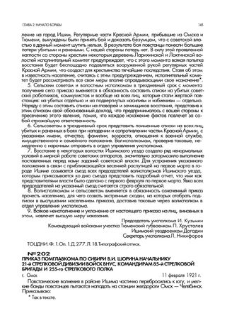 Приказ помглавкома по Сибири В.И. Шорина начальнику 21-й стрелковой дивизии войск ВНУС, командирам 85-й стрелковой бригады и 255-го стрелкового полка. г. Омск. 11 февраля 1921 г.