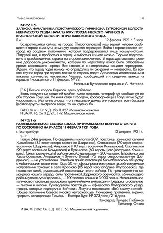 Записка начальника повстанческого гарнизона Бугровской волости Ишимского уезда начальнику повстанческого гарнизона Красноярской волости Петропавловского уезда. 12 февраля 1921 г. 3 часа // ГАНО. Ф.п. 1. Оп. 9. Д. 15а. Л. 327. Машинописная копия. РГВА. Ф. 16. Оп. 3. Д. 97. Л. 49. Машинописная копия.