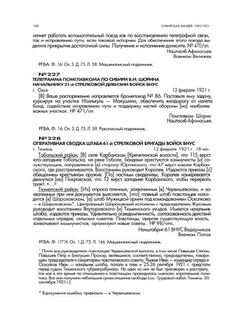 Телеграмма помглавкома по Сибири В.И. Шорина начальнику 21 -й стрелковой дивизии войск ВНУС. г. Омск .12 февраля 1921 г. // РГВА. Ф. 16. Оп. 3. Д. 75. Л. 59. Рукописный подлинник.