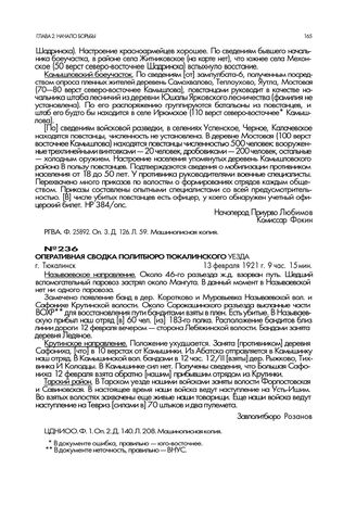 Оперативная сводка политбюро Тюкалинского уезда. г. Тюкалинск, 13 февраля 1921 г. 9 час. 15 мин // ЦДНИОО. Ф. 1. Оп. 2. Д. 140. Л. 208. Машинописная копия.