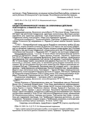 Сводка Екатеринбургской губчека об оперативных действиях повстанцев на 13 февраля 1921 года. г. Екатеринбург. 14 февраля 1921 г. // РГВА. Ф. 25892. Оп. 3. Д. 72. Л. 34. Машинописный подлинник.