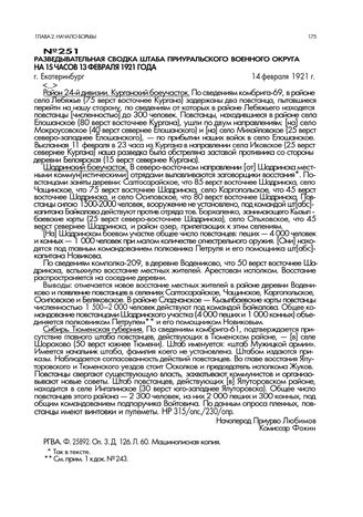 Разведывательная сводка штаба Приуральского военного округа на 15 часов 13 февраля 1921 года. г. Екатеринбург. 14 февраля 1921 г.
