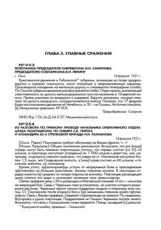 Из разговора по прямому проводу начальника оперативного отдела штаба помглавкома по Сибири С.В. Пирога и командира 85-й стрелковой бригады Н.Н. Рахманова. 14 февраля 1921 г. // РГВА. Ф. 16. Оп. 3. Д. 86. Лл. 76-78. Телеграфный бланк.