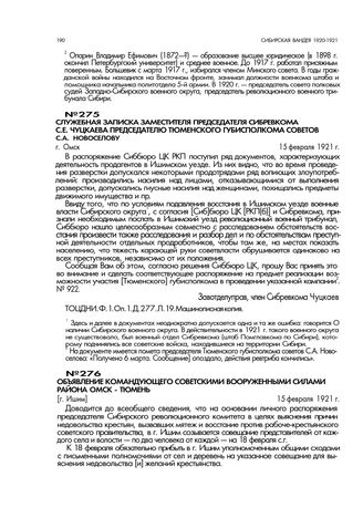 Служебная записка заместителя председателя Сибревкома С.Е. Чуцкаева председателю Тюменского губисполкома советов С.А. Новоселову. г. Омск. 15 февраля 1921 г. // ТОЦДНИ. Ф. 1. Оп. 1. Д. 277. Л. 19. Машинописная копия.