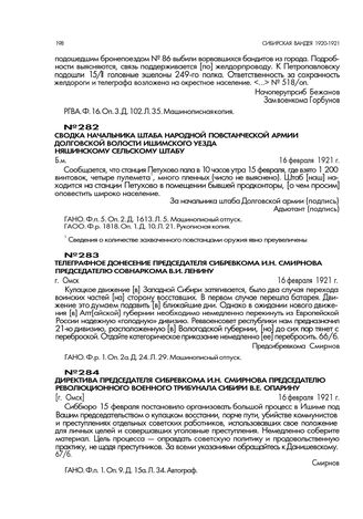 Сводка начальника штаба народной повстанческой армии Долговской волости Ишимского уезда Няшинскому сельскому штабу. 16 февраля 1921 г. // ГАНО. Ф.п. 5. Оп. 2. Д. 1613. Л. 5. Машинописный отпуск. ГАОО. Ф. р. 1818. Оп. 1. Д. 10. Л. 21. Рукописная копия.