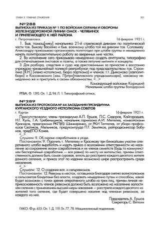 Выписка из протокола № 44 заседания президиума Курганского уездного исполкома советов. г. Курган. 16 февраля 1921 г. // ГАКО. Ф.р . 635. Оп. 1. Д. 119. Лл. 77, 78. Машинописный подлинник.