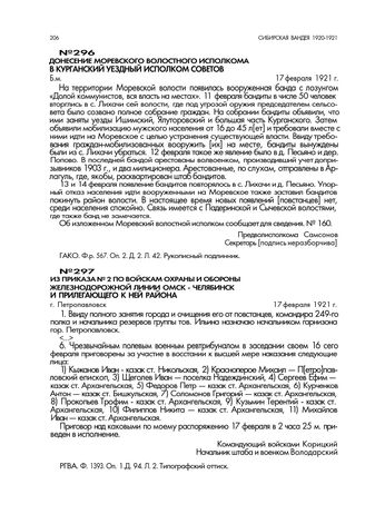 Из приказа № 2 по войскам охраны и обороны железнодорожной линии Омск - Челябинск и прилегающего к ней района. г. Петропавловск. 17 февраля 1921 г. // РГВА. Ф. 1393. Оп. 1. Д. 94. Л. 2. Типографский оттиск.