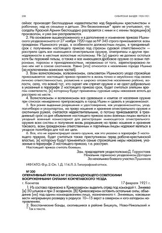 Оперативный приказ № 2 командующего советскими вооруженными силами Кокчетавского уезда. г. Кокчетав. 17 февраля 1921 г. // РГВА. Ф. 28324. Оп. 1. Д. 1. Л. 5. Машинописный подлинник.