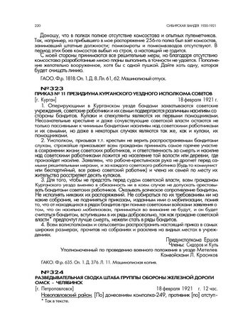 Приказ № 11 президиума Курганского уездного исполкома советов. [г. Курган]. 18 февраля 1921 г. // ГАКО. Ф. р. 635. Оп. 1. Д. 376. Л. 11. Машинописная копия.