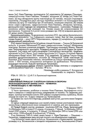 Оперативный приказ № 12 войскам охраны и обороны железнодорожной линии Омск - Челябинск и прилегающего к ней района. г. Петропавловск. 18 февраля 1921 г. // РГВА. Ф. 1393. Оп. 1. Д. 42. Л. 6. Машинописный подлинник.