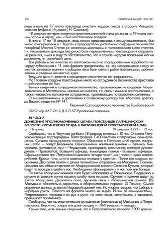 Донесение уполномоченных штаба повстанцев Лапушинской волости Курганского уезда в Лапушинский повстанческий штаб. ст. Петухово. 19 февраля 1921 г. 12 час