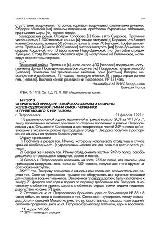 Оперативный приказ № 14 войскам охраны и обороны железнодорожной линии Омск - Челябинск и прилегающего к ней района. г. Петропавловск. 21 февраля 1921 г. // РГВА. Ф. 1393. Оп. 1. Д. 42. Л. 9. Машинописный подлинник.