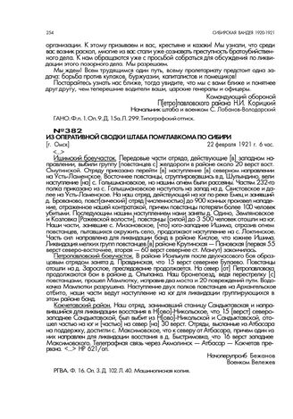 Из оперативной сводки штаба помглавкома по Сибири. [г. Омск]. 22 февраля 1921 г. 6 час // РГВА. Ф. 16. Оп. 3. Д. 102. Л. 40. Машинописная копия.