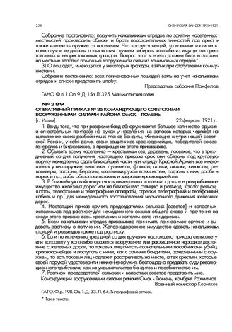 Оперативный приказ № 25 командующего советскими вооруженными силами района Омск - Тюмень. [г. Ишим]. 22 февраля 1921 г. // ГАТО. Ф. р. 198. Оп. 1. Д. 33. Л. 64. Типографский оттиск.