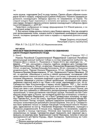 Приговор Реввоентрибунала Сибири по обвинению шести граждан Ишимского уезда. [г. Ишим]. Не ранее 22 февраля 1921 г. // ГАНО. Фл. 1. Оп. 9. Д. 15а. Л. 66. Машинописный отпуск.