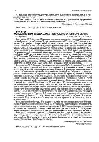 Разведывательная сводка штаба Приуральского военного округа. г. Екатеринбург. 23 февраля 1921 г. 18 час // РГВА. Ф. 25892. Оп. 3. Д. 126. Л. 83. Машинописная копия.