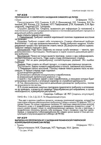 Выписка из протокола № 5 заседания Тюменской губернской контрольной комиссии РКП(б). г. Тюмень. 24 февраля 1921 г. // ТОЦДНИ. Ф. 2. Оп. 1. Д. 1. Лл. 9, 10. Рукописный подлинник.