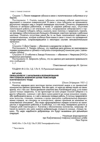 Приказание № 1 начальника формирования при главном военном штабе повстанцев Кокчетавского уезда. [г. Кокчетав]. Около 24 февраля 1921 г. // ГАНО. Ф.п. 1. Оп. 9. Д. 15а. Л. 202. Типографский оттиск.