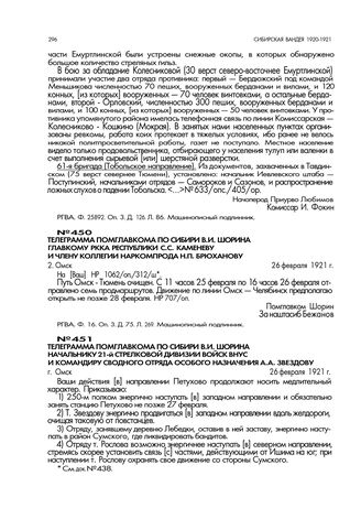 Телеграмма помглавкома по Сибири В.И. Шорина главкому РККА Республики С.С. Каменеву и члену коллегии Наркомпрода Н.П. Брюханову. г. Омск. 26 февраля 1921 г.