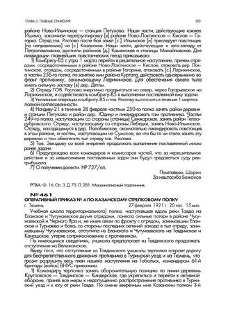Оперативный приказ № 4 по Казанскому стрелковому полку. г. Тюмень. 27 февраля 1921 г. 20 час. 15 мин // РГВА. Ф. 17718. Оп. 1. Д. 70. Л. 111. Машинописная копия.