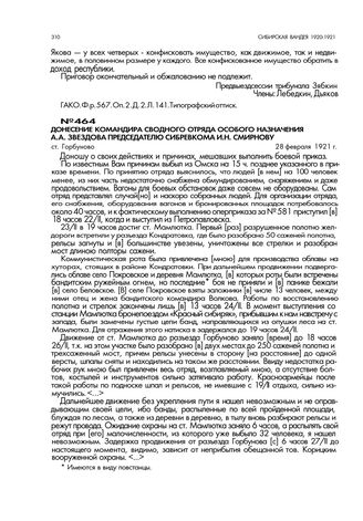 Донесение командира сводного отряда особого назначения А.А. Звездова председателю Сибревкома И.Н. Смирнову. ст. Горбуново. 28 февраля 1921 г. // РГВА. Ф. 16. Оп. 3. Д. 86. Лл. 466-469. Телеграфный бланк.
