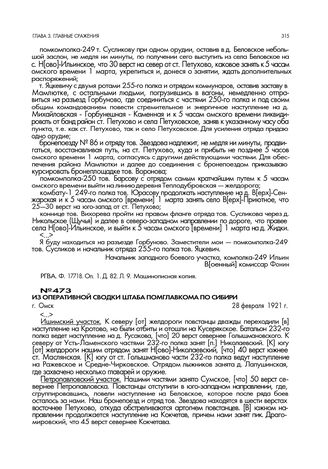 Из оперативной сводки штаба помглавкома по Сибири. г. Омск. 28 февраля 1921 г. // РГВА. Ф. 16. Оп. 3. Д. 75. Л. 289. Машинописный подлинник.