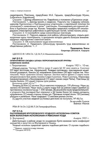 Оперативная сводка штаба Петропавловской группы советских войск. г. Петропавловск. 4 марта 1921 г. 10 час // РГВА. Ф 16. Оп. 3. Д. 88. Л. 24. Телеграфный бланк.