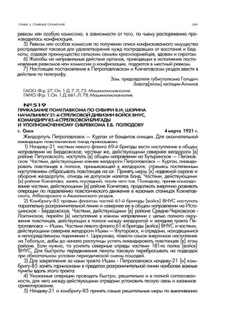 Приказание помглавкома по Сибири В.И. Шорина начальнику 21-й стрелковой дивизии войск ВНУС, командиру 85-й стрелковой бригады и уполномоченному Сибревкома Е.В. Полюдову. г. Омск. 4 марта 1921 г.