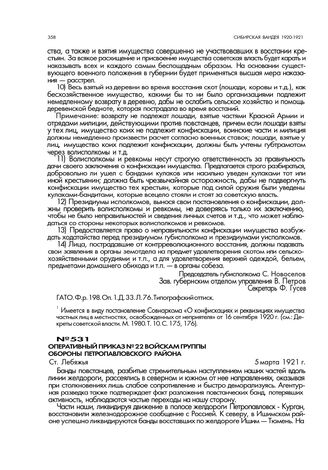 Оперативный приказ № 22 войскам группы обороны Петропавловского района. Ст. Лебяжья. 5 марта 1921 г. // РГВА. Ф. 1393. Оп. 1. Д. 43. Л. 50. Машинописный отпуск.