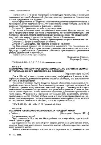 Воззвание Тобольского главного штаба народной армии. г. Тобольск. Не позднее 10 марта 1921 г. // ЦДООСО. Ф. 41. Оп. 1 .Д. 141. Л. 91. Типографский оттиск. Опубликовано в кн.: Корушин Т.Д. Дни революции и советского строительства в Ишимском округе. С. 64.