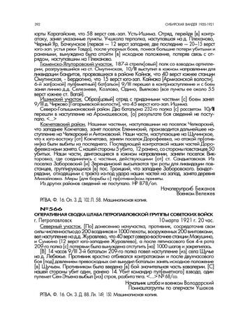 Оперативная сводка штаба Петропавловской группы советских войск. г. Петропавловск. 10 марта 1921 г. 20 час // РГВА. Ф. 16. Оп. 3. Д. 88. Лл. 149, 150. Машинописная копия.