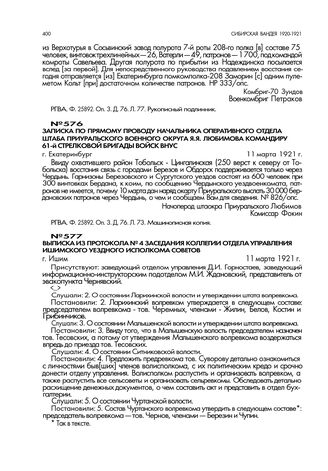 Выписка из протокола № 4 заседания коллегии отдела управления Ишимского уездного исполкома советов. г. Ишим. 11 марта 1921 г. // ГАТО. Ф. р. 2. Оп. 1. Д. 225. Л. 30. Машинописная копия.