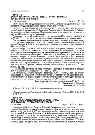 Оперативный приказ № 23 войскам группы обороны Петропавловского района. ст. Петропавловск. 14 марта 1921 г. // РГВА. Ф. 1393. Оп. 1. Д. 42. Л. 21. Машинописный подлинник.