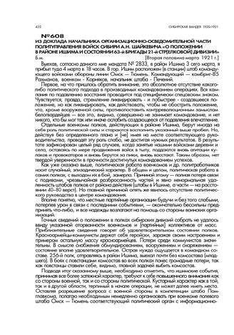 Из доклада начальника организационно-осведомительной части политуправления войск Сибири А.Н. Шайкевича «О положении в районе Ишима и состоянии 63-й бригады 21-й стр[елковой] дивизии». Вторая половина марта 1921 г. // РГВА. Ф. 16. Оп. 2. Д. 88. Л. 26. Машинописный подлинник. ГАНО. Ф. р. 1. Оп. 2. Д. 46. Л. 151. Машинописная копия.
