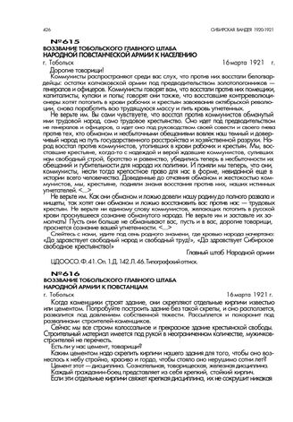Воззвание Тобольского главного штаба народной повстанческой армии к населению. г. Тобольск. 16 марта 1921 г.