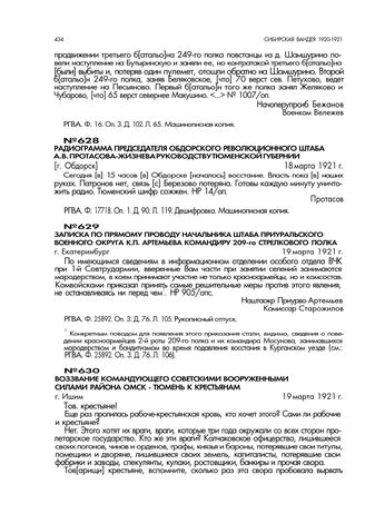 Записка по прямому проводу начальника штаба Приуральского военного округа К.П. Артемьева командиру 209-го стрелкового полка. г. Екатеринбург. 19 марта 1921 г. // РГВА. Ф. 25892. Оп. 3. Д. 76. Л. 105. Рукописный отпуск.