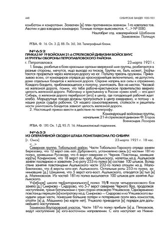 Приказ № 19 войскам 21-й стрелковой дивизии войск ВНУС и группы обороны Петропавловского района. г. Петропавловск. 23 марта 1921 г. // РГВА. Ф. 1393. Оп. 1. Д. 95. Л. 16. Машинописный подлинник.