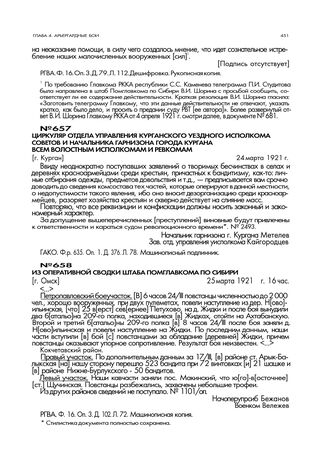 Циркуляр отдела управления Курганского уездного исполкома советов и начальника гарнизона города Кургана всем волостным исполкомам и ревкомам. [г. Курган]. 24 марта 1921 г. // ГАКО. Ф. р. 635. Оп. 1. Д. 376. Л. 78. Машинописный подлинник.