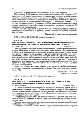 Приказ Заводоуспенского волостного ревкома Тюменского уезда всем сельским ревкомам и старшему милиционеру волости. [с. Успенское]. 31 марта 1921 г. // ГАТО. Ф. р. 488. Оп. 1. Д. 1. Л. 91. Рукописный подлинник.