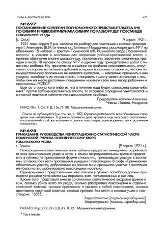 Приказание руководства регистрационно-статистической части Тюменской губчека политическому бюро Тобольского уезда. г. Тюмень. 9 апреля 1921 г. // ТФ ГАТО. Ф. р. 272. Оп. 3. Д. 42. Л. 121. Машинописный подлинник.
