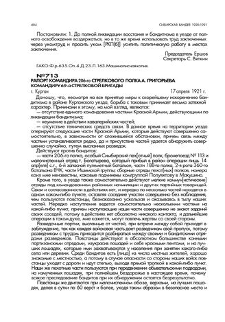 Рапорт командира 206-го стрелкового полка А. Григорьева командиру 69-й стрелковой бригады. г. Курган. 17 апреля 1921 г. // РГВА. Ф. 25892. Оп. 3. Д. 71. Л. 140. Машинописная копия.