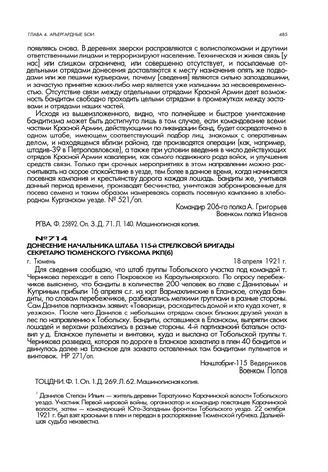 Донесение начальника штаба 115-й стрелковой бригады секретарю Тюменского губкома РКП(б). г. Тюмень. 18 апреля 1921 г. // ТОЦДНИ.Ф. 1. Оп. 1. Д. 269. Л. 62. Машинописная копия.