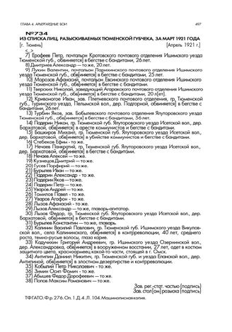 Из списка лиц, разыскиваемых Тюменской губчека, за март 1921 года. [г. Тюмень]. Апрель 1921 г. // ТФ ГАТО. Ф. р. 276. Оп. 1. Д. 4. Л. 104. Машинописная копия.