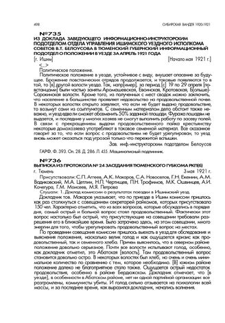 Из доклада заведующего информационно-инструкторским подотделом отдела управления Ишимского уездного исполкома советов В.Т. Белоусова в Тюменский губернский информационный подотдел о положении в уезде за апрель 1921 года. [г. Ишим]. Начало мая 1921 г. // ГАРФ. Ф. 393. Оп. 28. Д. 286. Л. 455. Машинописный подлинник.