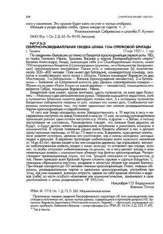 Секретно-разведывательная сводка штаба 115-й стрелковой бригады. г. Тюмень. 17 мая 1921 г. 1 час // РГВА. Ф. 17718. Оп. 1. Д. 73. Л. 385. Машинописная копия.